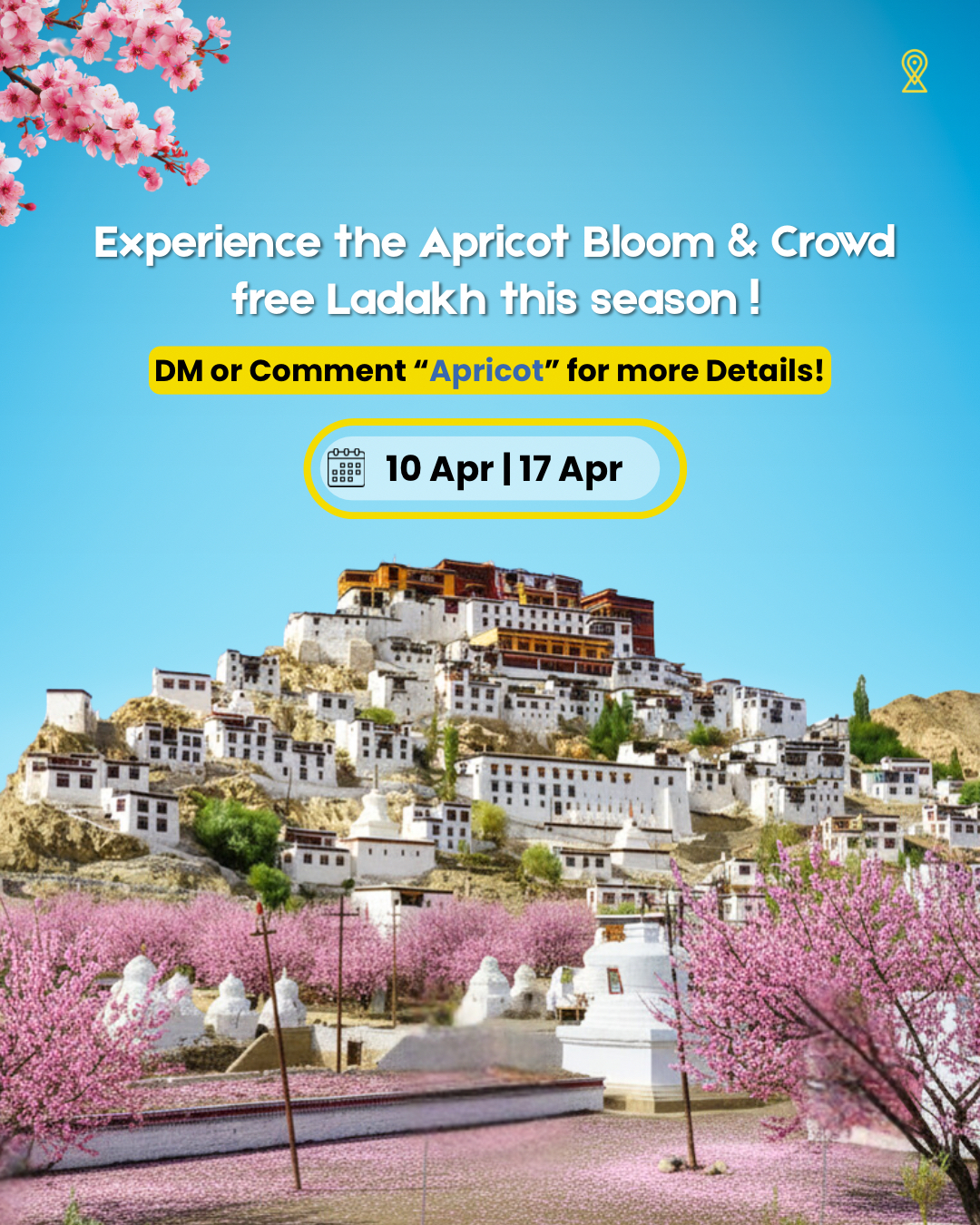 eh Town – The charming capital of Ladakh surrounded by snow-capped peaks, vibrant local markets, and peaceful mountain vibes in spring. Aryan Valley (Dha & Hanu Village) – A culturally rich valley where rare Brokpa villages come alive with blooming apricot trees and stunning mountains. Apricot Blossom Landscapes – Witness valleys painted in shades of white and pink as apricot orchards bloom across Ladakh. Kargil to Leh via Namik La – A breathtaking high-altitude drive across dramatic mountain terrain and scenic high mountain passes. Lamayuru Monastery & Moonland – Explore the ancient monastery set against surreal moon-like landscapes unique to this region. Khardung La Pass – One of the world’s highest motorable passes offering panoramic Himalayan views and a thrilling road journey. Pangong Lake (Crowd-Free Experience) – Experience the changing blue hues of the lake in a peaceful, less crowded spring season. Turtuk Village – A beautiful border village near Baltistan known for blossoming apricot trees, Balti culture, and scenic charm. Thiksey Monastery – A magnificent hilltop monastery offering spiritual serenity and stunning views over the valley. Better Flight Deals Compared to Peak Season – Enjoy more affordable airfares and a relaxed travel experience during the blossom season..